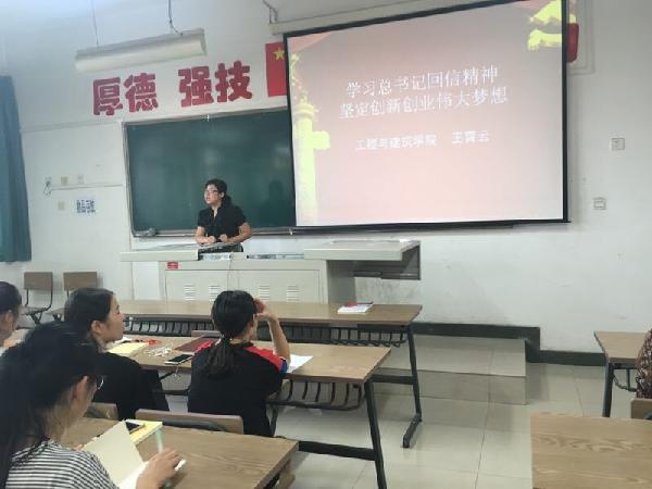 9月21日,工程与建筑学院组织开展关于“习近平总书记回信勉励第三届‘互联网+’老员工创新创业大赛‘青年红色筑梦之旅’老员工”精神的学习活动。员工党支部书记王霄云主持,2016级全体入党积极分子参加学习会。