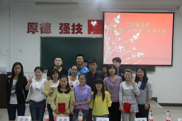 为丰富同学们的精神文化生活,促进同学们全面健康发展,工程管理系第二届“好声音”歌手大赛(决赛)于2015年5月21日19:00在教学楼东103教室隆重举行。工程管理系李灿副主任、各级辅导员作为评委参加了本次活动。